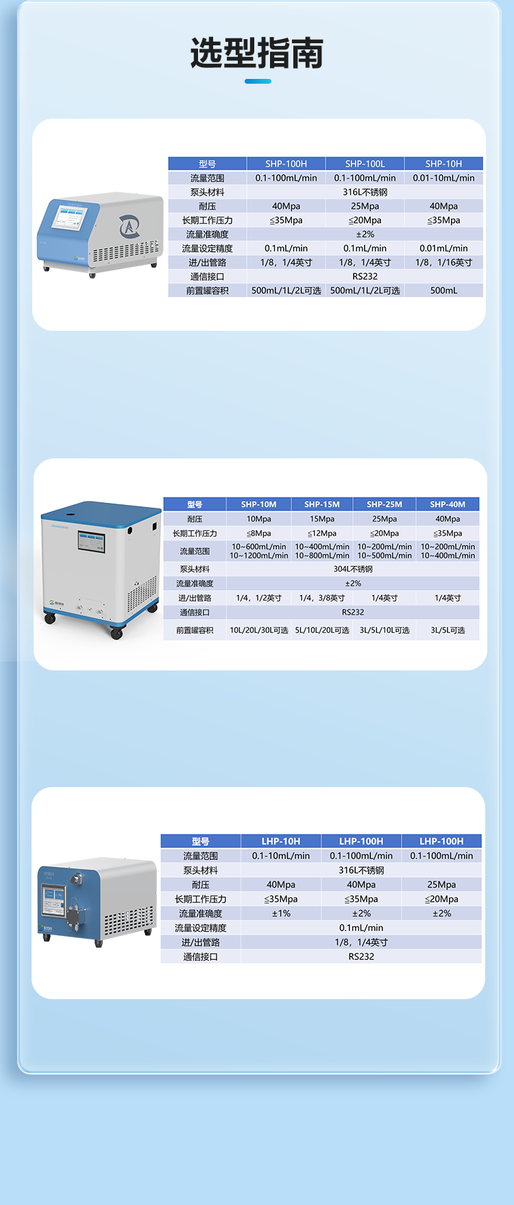 壓力:0-20MPa,流速:0-100ml/min,500ml內置前置制 冷罐,7寸觸摸屏操作,壓力上限設置,恒流恒壓輸送模 式